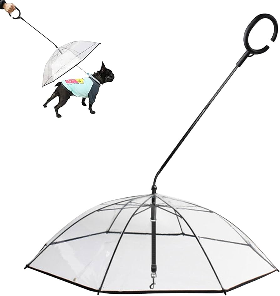 GUARDA CHUVA PET CONFECCIONADO EM MATERIAL PLASTICO TRANSPARENTE, COM ESTRUTURA LEVE E HASTE METÁLICA, EQUIPADO COM SISTEMA DE ENGATE PARA COLEIRA PEITORAL