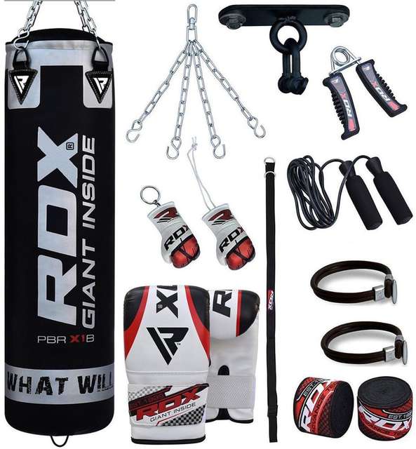 KIT BOXING CONTENDO SACO DE PANCADA COM ESTRUTURA INTERNA ALMOFADADA E ESTRUTURA EXTERNA EM PU DE 120CM, PAR DE LUVAS COM PARTE INTERNA EM TECIDO DE MALHA RESPIRAVEL E PARTE EXTERNA EM PU, TREINADOR DE FORCA DE AGARRO, CORDA, CINTA EMBALADA A MAO, GANCHOS GIRATORIOS EM ACO INOXIDAVEL, PARAFUSOS DE ESPANSAO, MOSQUETAO, CORRENTE DE ACO, 1 PAR DE PROTETORES DE PULSO, 1 PAR DE MANOPLAS DE PULSO, 1 PAR DE PROTETOR DE PALMA, 1 PAR DE PROTETORES DE TORNOZELO E 1 FAIXA DE CABEÇA = BXGL-268-B-2