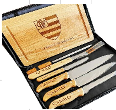 KIT PARA CHURRASCO CONTENDO 4 FACAS EM ACO INOX COM CABO EM MADEIRA, 1 GARFO DE ASSADO EM ACO INOX COM CABO E MADEIRA, 1 CHAIRA EM ACO INOX COM CABO EM MADEIRA E 1 TABUA EM MADEIRA
