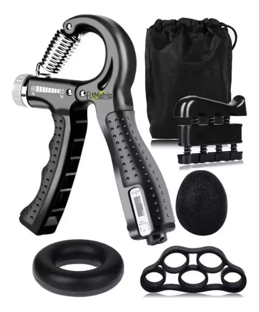 KIT PARA FORTALECIMENTO DE MAOS E PUNHO (HAND GRIP), COM RESISTENCIA AJUSTAVEL, FABRICADO EM PLASTICO E METAL, UTILIZADO PARA EXERCICIOS DE FORCA E REABILITACAO, ACOMPANHADO DE ACESSORIOS, SENDO: EXTENSOR DE DEDOS EM SILICONE, BOLA DE EXERCICIO, ANEL DE RESISTENCIA, FAIXA DE EXERCICIO PARA DEDOS, PEGADORES AUXILIARES E BOLSA PARA TRANSPORTE.