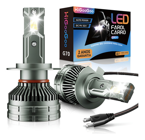 PAR DE LAMPADAS DE LED PARA FAROL DE CARRO COM 80W DE POTENCIA, BRILHO DE 7000 LUMENS, TEMPERATURA DA COR DE 6500K, RESISTENTE A AGUA, MARCA HIGOOGOO