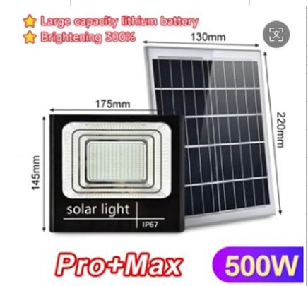 REFLETOR LED SOLAR PARA ILUMINACAO EXTERNA, COM PAINEL SOLAR FOTOVOLTAICO SEPARADO, CORPO EM METAL E VIDRO, COM BATERIA RECARREGAVEL DE LITIO INTEGRADA, POTENCIA NOMINAL DE 500W, FLUXO LUMINOSO ELEVADO, TEMPERATURA DE COR BRANCO FRIO, RESISTENTE A INTEMPERIES, INDICADO PARA USO EXTERNO.